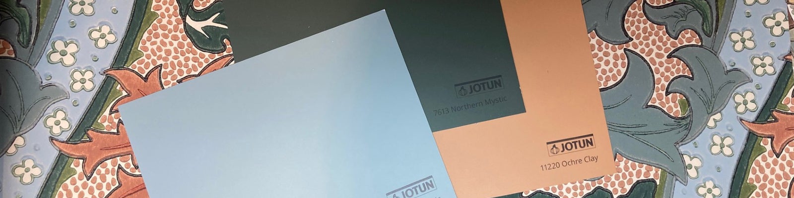 Till Cornflower Russet Teal har Jessica plockat fram kulörerna 6378 Iconic som 7613 Northern Mystic  och 11220 Ochre Clay från Jotuns kulörer och som matchar perfekt till Daisy & Oak i den här färgställningen. Även här hittar hon fyra nya kulörer för moderna hem som ingår ett fantastiskt fint äktenskap med kulörerna i tryckfärgen.