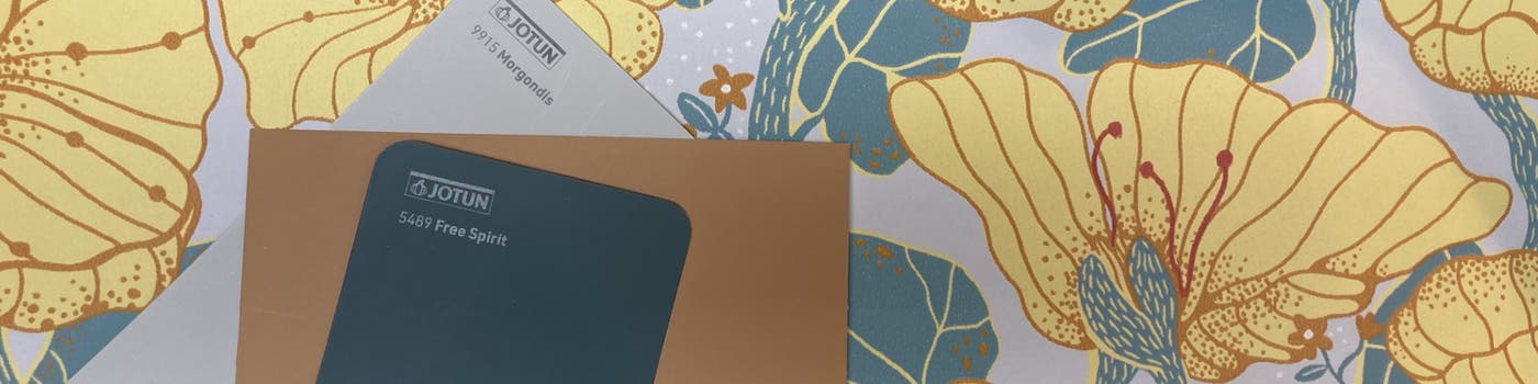 Till denna skönhet har vår duktiga kollega Jessica valt ut tre vackra Jotunkulörer för färgsättning utifrån tapeten. Jotunkulörerna 9915 Morgondis som är en kall neutral grå som passar fint ihop med den varma gula och matchar botten. Den dämpad grönblå nyansen 5489 Free Spirit som plockar upp den grönblå accentkulören i bladen och den gyllene 11220 Ochre Clay.
