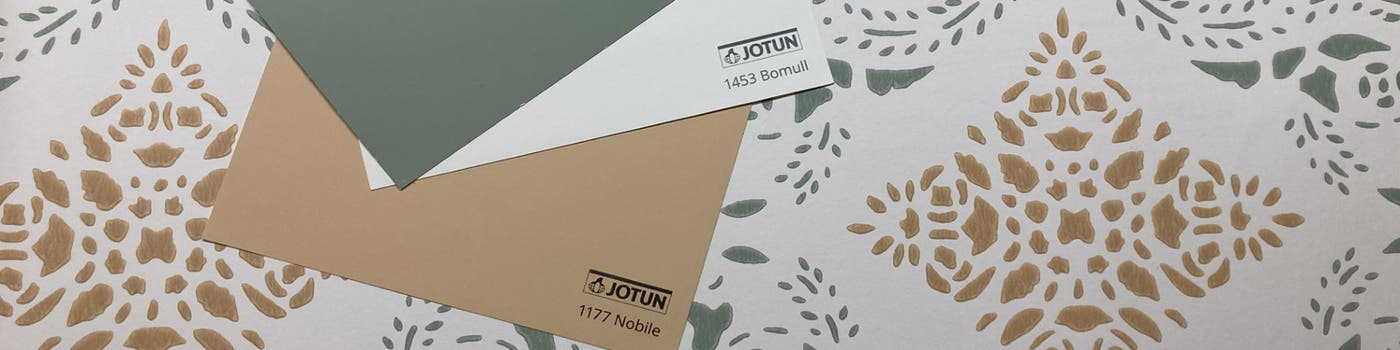 Till den vackra schablontapeten Dahlströmska gården har Jessica plockat fram tre Jotunkulörer som passar fint till. Alla tre tillsammans eller en i taget. Dahlströmska Gården kommer från Duro och kollektionen Gammalsvenska Quickup och är i den här färgställningen tryckt i en dämpad grön samt en dämpad gulton Den gröna kulörer lyfts fram med snickerier i härliga 7685 Subtle Green en lugn grön som passar i allt från kök och sovrum till vardagsrum. En varm pudrig persikoorange nyans som 1177 Nobile agerar ton i ton med den ockragula i trycket. 1453 Bomull är en gyllene vit med en subtil gul underton som utstrålar värme. En kulör som är perfekt ihop med de gyllene nyanserna i tapeten.